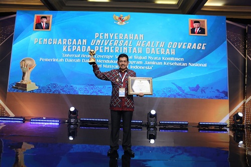 Penghargaan bertajuk “UHC Sebagai Wujud Nyata Komitmen Pemerintah Daerah Dalam Mendukung Program Jaminan Kesehatan Nasional Bagi Masyarakat Indonesia,” diserahkan langsung oleh Wakil Presiden kepada 22 Gubernur serta Menteri Dalam Negeri Tito Karnavian kepada Wali Kota/Bupati dan disaksikan Menko PMK, Menteri Keuangan, Menteri Kesehatan, Menteri Sosial, Kepala Bappenas, Direktur BPJS Kesehatan dan Ketua Dewan Jaminan Sosial Nasional di Balai Sudirman, Tebet, Jakarta Selatan, Selasa (14/03/2023).