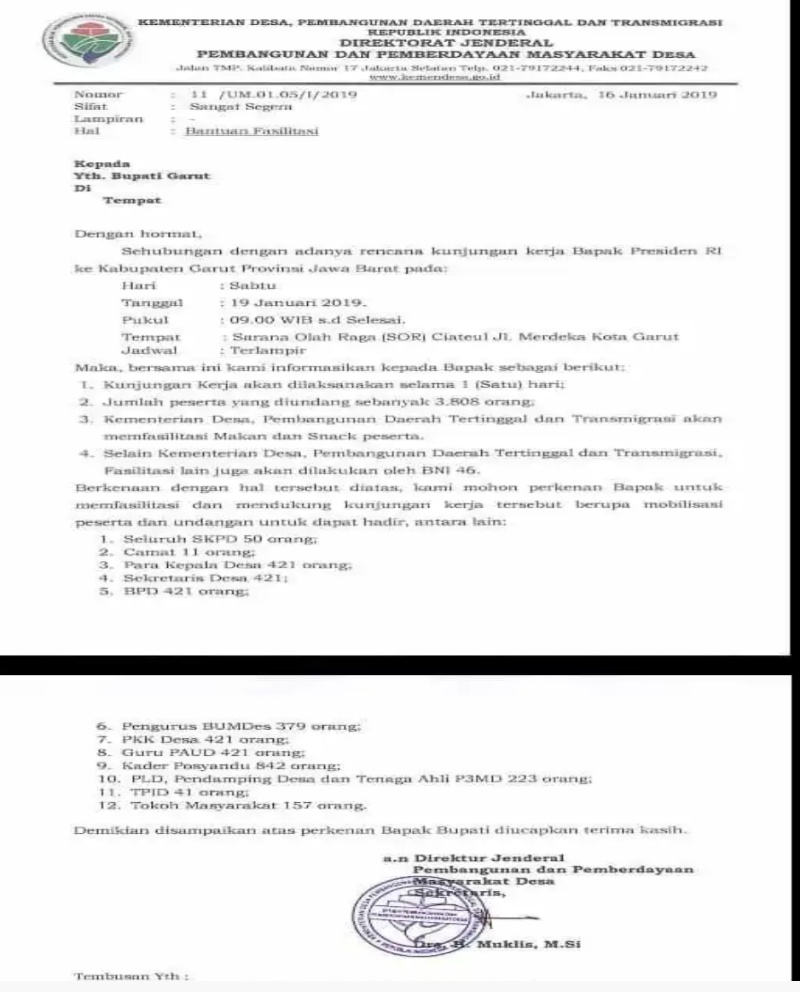 Zonasatu News–Biaya kunjungan Presiden Joko Widodo (Jokowi) ke Kabupaten Garut, Sabtu (19/1) ternyata harus ditanggung oleh industri perbankan. Dalam surat Kementerian Desa yang bocor ke publk, Bank BNI 1946 harus memfasilitasi kunjungan itu.Bocoran surat itu dungkap oleh mantan Stafsus Menteri BUMN 2014-2016, Muhammad Said Didu melalui akun pribadinya di Twitter. Said Didu menganggap tindakan itu dianggap tidak sepatutnya dilakukan.