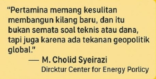“Pertamina memang kesulitan membangun kilang baru, dan itu bukan semata soal teknis atau dana, tapi juga karena ada tekanan geopolitik global,” ujarnya dengan nada serius.