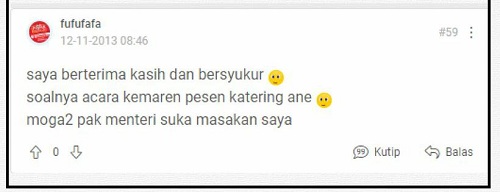 Dalam postingannya, Akun Fufufafa di KasKus saat tersebut menulis “saya berterima kasih dan bersyukur ???? soalnya acara kemaren pesen katering ane ???? moga2 pak menteri suka masakan saya” . Analisis dan penjelasan tulisan (terlampir) diatas besok akan disampaikan setelah melihat apa jawaban dan sikap dari BAS dalam menjawab Surat Terbuka & Tantangan ini. Namun tidak seperti yang pernah ditulis soal “Menunggu Godot” beberapa waktu lalu, maka jika saat itu dianalogikan dengan menonton kisah drama klasik yang aalinya berbahasa Prancis dan berjudul “En attendant Godot” , sebuah ungkapan umum menunggu Godot yang kemudian diartikan sebagai menunggu sesuatu yang tak kunjung datang.