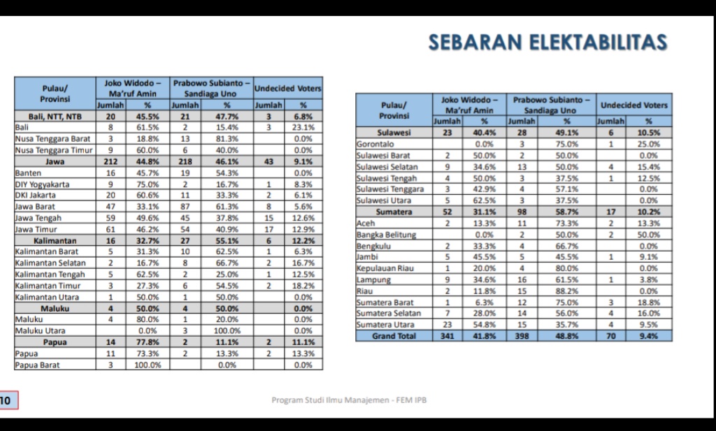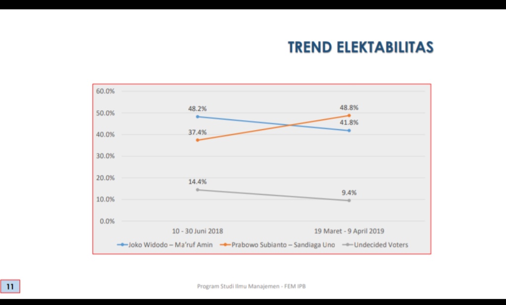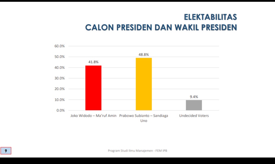 Zonasatu News–Institut Pertanian Bogor (IPB) Program Studi Ilmu Managemen mengadakan survey elektabilitas dan orientasi pertanian Calon Presiden. Survey diadakan tanggal 19 Maret- 9 April 2019. Dari hasil survey ditemukan elektabilitas Prabowo-Sandi mencapai 48,8 persen unggul atas Jokowi-Amin yang hanya mencapai angka elektabilitas sebesar 41,8 persen. Sementara 9,4 persen belum menentukan pilihan (undecided voters).