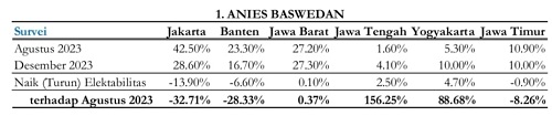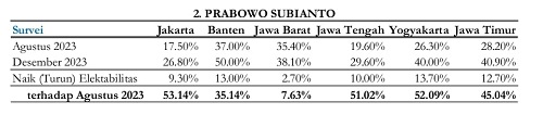 Pada Agustus 2023, Anies diperkirakan menang mutlak di Jakarta dengan elektabilitas 42,5 persen. tetapi kini dibuat harus bersaing ketat bersama semua calon. Di Banten, semua calon pada Agustus 2023 masih bersaing ketat, tetapi per Desember 2023 Prabowo melenggang sendirian tanpa lawan, dengan lonjakan suara dari 37 persen menjadi 50 persen.