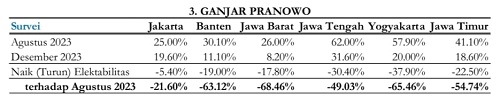 Elektabilitas Ganjar di Pulau Jawa turun 53,5 persen, di semua wilayah. Di Jawa Barat turun 68,5 persen, Yogyakarta turun 65,5 persen, Banten turun 63,1 persen, Jawa Timur turun 54,7 persen, Jawa Tengah turun 49 persen dan Jakarta turun 21,6 persen.
