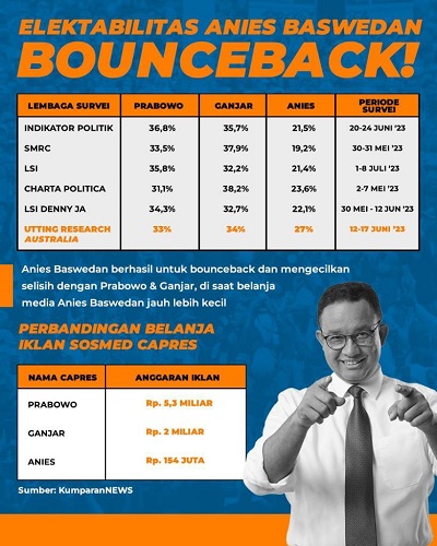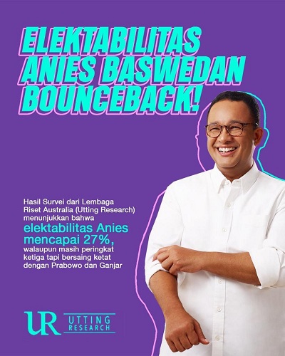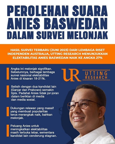 Lembaga survei independen dari Australia, Utting Research, merilis hasil survei terbaru tiga bakal calon presiden terpopuler di Indonesia, yaitu Anies Baswedan, Ganjar Pranowo, dan Prabowo Subianto. Survei ini dilakukan selama Juni 2023. Hasil survei tersebut berbeda dengan umumnya lembaga survei di Indonesia selama ini.