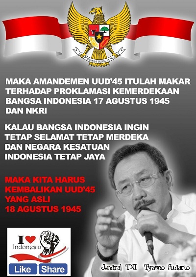 “Kalau Bangsa Indonesia ingin tetap selamat tetap merdeka dan Negara Kesatuan Republik Indonesia tetap terjaga – maka kita harus kembali ke UUD 45 yang asli 18 Agustus 1945”