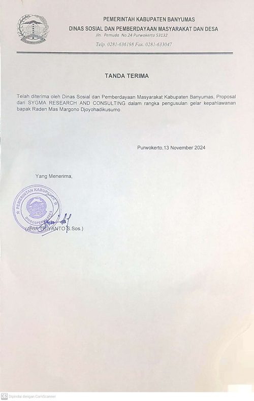“Maturnuwun, berkas dan dokumen hasil FGD RM Margono di Jawa Timur diterima dan ini merupakan usulan pertama dari masyarakat ke Pemkab Banyumas dalam rangka proses pengusulan salah satu putra terbaik Banyumas untuk meraih Gelar Pahlawan Nasional. Tentunya ini akan diproses sebagai usulan dan dibahas di Pemkab Banyumas kemudian di usulkan ke Pemprov Jateng. Selanjutnya ke Pusat, ” kata Arif saat menerima tim peneliti SRC di ruang kerjanya Rabu (13/11/2024).