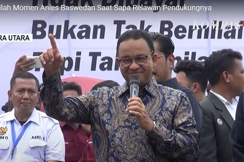 Anies Baswedan menyapa relawannya di Medan, Sumatera Utara, Sabtu (5/11/2024). Mantan Gubernur DKI Jakarta itu merupakan bakal calon presiden yang diusung Partai Nasdem.(KOMPAS TV)