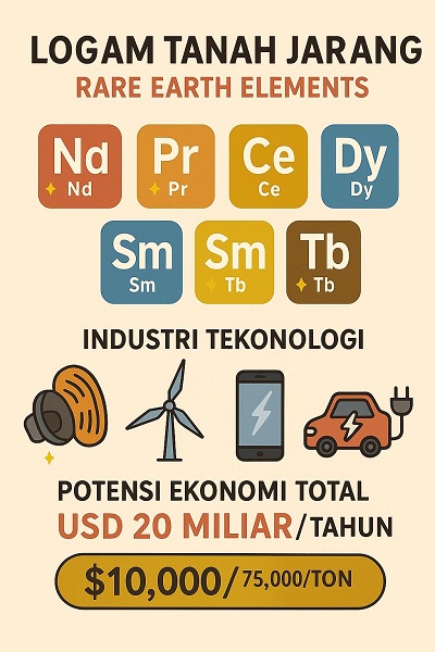 Logam Tanah Jarang, atau Rare Earth Elements (REE), bukan satu logam, melainkan kumpulan 17 unsur kimia — mulai dari neodymium, praseodymium, cerium, hingga lanthanum.