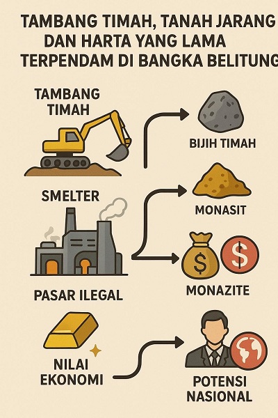 Selama puluhan tahun, Bangka Belitung dikenal sebagai negeri penghasil timah. Namun di balik pasir timah yang dicuci dan dilebur, ternyata terselip mineral lain — monasit dan xenotime — pembawa Logam Tanah Jarang.