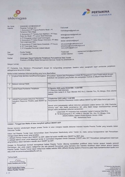 Anehnya, sambung Yusri, panitia tender diduga malah melalukan post bidding dengan tahapan awal mengeluarkan undangan nomor SA04022611A/VIII/2025/S-07 tanggal 11 Agustus 2025 dengan judul Undangan Rapat Pemberian Penjelasan Pemutakhiran Data Tender kepada keenam peserta pada tanggal 19 Agustus 2025 pukul 09.00 WIB hingga 12.00 WIB di gedung PT Pertamina Hulu Indonesia, menetapkan jadwal Penyampaian Dokumen Penawaran mengikuti Response Timeline pada SMART by GEP pada 2 September 2025 pukul 14.00 WIB.