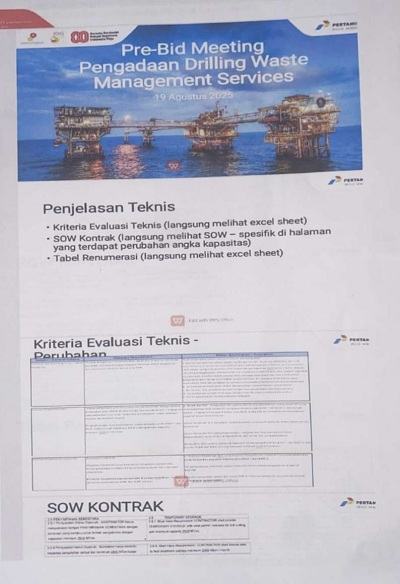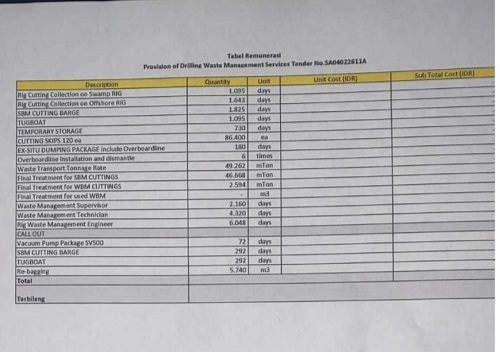 “Kegiatan inilah yang kami duga adalah post bidding yang dilarang menurut aturan Pedoman Tata Kerja (PTK) nomor 007/SKKIA0000/2023/S-9. Seharusnya Panitia Tender cukup melakukan pemutakhiran data sesuai Pertek Kementerian Lingkungan Hidup tanpa harus mewajibkan peserta tender menyampaikan dokumen penawaran (post bidding). Sebab, Pertek LH tidak merubah lingkup pekerjaan, hanya mengurangin volume saja, lantaran surat Menteri Lingkungan Hidup mensyaratkan untuk limbah serbuk bor berbahan dasar air atau water base mud bisa dibuang ke laut jika semua syarat terpenuhi, bukan hanya kandungan minyak 10 ppm saja,” ungkap Yusri.