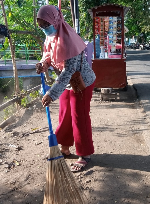 Terlihat Isya Fitri R ( memakai masker ) sebelum dan sesudah jualan selalu membersihkan lokasi jualannya.