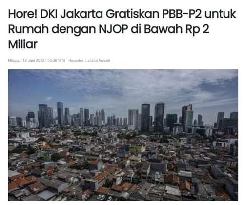 Semoga semakin banyak daerah yang tergerak hatinya membebaskan PBB. Dan jangan kasih batas atas. Semua rumah, yang ditinggali penduduk, bebaskan saja. Aturan2 lama itu dihapus. Ini bukan jaman VOC, kerajaan, dll.