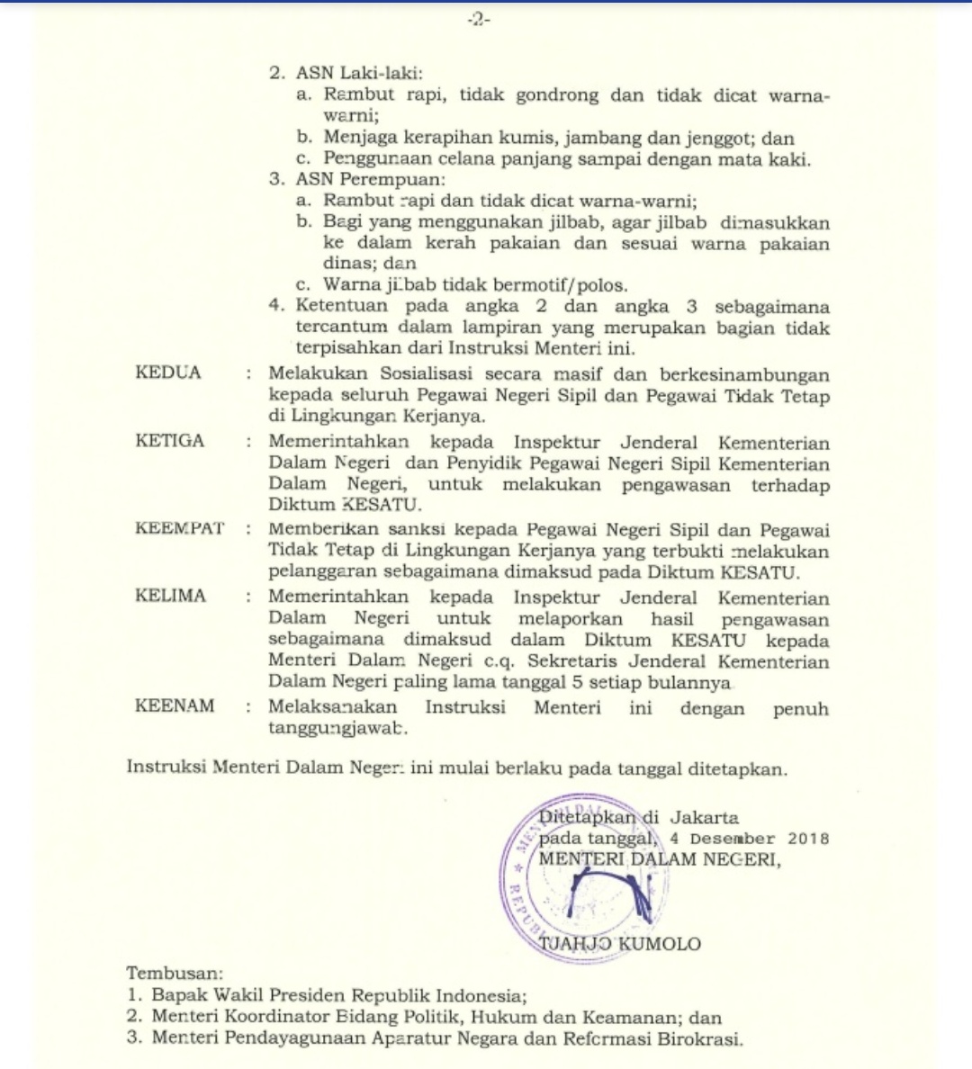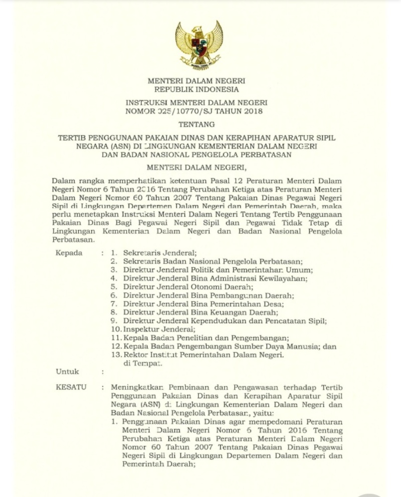 Instruksi yang dicabut itu adalah Instruksi Menteri Dalam Negeri Nomor 025/10770/SJ Tahun 2018 tentang Tertib Penggunaan Pakaian Dinas dan Kerapihan Aparatur Sipil Negara (ASN) di Lingkungan Kementerian Dalam Negeri dan Badan Nasional Pengelola Perbatasan. Tjahjo meneken instruksi itu pada 4 Desember 2018.