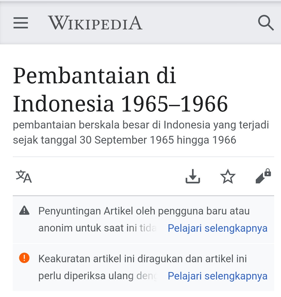 ZONASATUNEWS.COM–Upaya manipulasi sejarah G30S/PKI rupanya terus dilakukan secara sistematis, terstruktur, dan masif (STM). Salah satu artikel di Wikipedia bahasa Indonesia menjadi bukti nyata. Artikel itu berjudul “Pembantaian di Indonesia 1965–1966, pembantaian berskala besar di Indonesia yang terjadi sejak tanggal 30 September 1965 hingga 1966“.