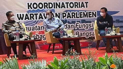 KETERANGAN FOTO : Ketua bersama Wakil Ketua DPD RI. (Dari kanan) Sultan B. Najamudin, Nono Sampono, Ketua DPD RI, Mahyudin, dalam acara Press Gathering DPD RI dengan Koordinatoriat Wartawan Parlemen di Bandung, Jumat (3/12/2021) malam.