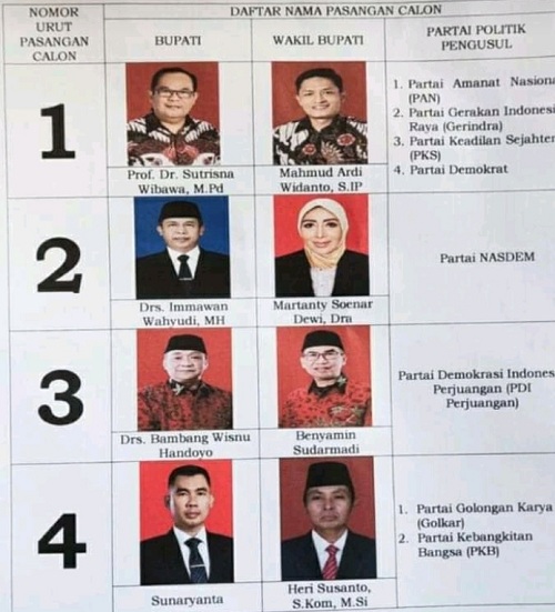 Dalam kancah Pilkada Gunungkidul Desember mendatang, ada 4 pasangan calon bupati dan wakil bupati yang siap berkompetisi untuk mengumpulkan suara terbanyak. Nomor urut :