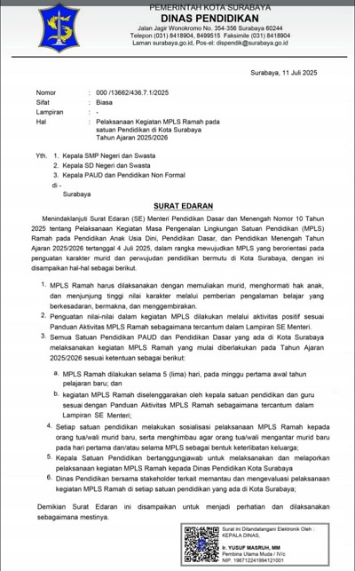 SURABAYA – Tahun ajaran baru 2025 / 2026 akan segera dimulai Senin, 14 Juli 2025. Sebagai kota layak anak, Surabaya melalui dinas pendidikan berkomitmen untuk mengawal tumbuh kembang anak dengan baik. Dalam rangka itu, Dinas Pendidikan Kota Surabaya, mengeluarkan SE Nomor 000/13662/436.7.1/2025 yang dikeluarkan tanggal 11 Juli 2025, yang salah satunya adalah menyerukan kepada semua walimurid agar mengantar putra putrinya pada hari pertama MPLS/ selama MPLS.