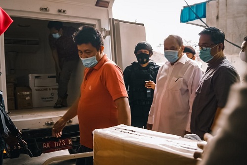 ZONASATUNEWS. COM, TEBINGTINGGI-SUMUT–Walikota Tebingtinggi Ir. H. Umar Zunaidi Hasibuan, MM, bersama Sekretaris Daerah Kota Tebingtinggi, Muhammad Dimiyathi, S.Sos, M.Tp, Kepala Dinas Kominfo Kota Tebingtinggi, Dedi Parulian Siagian, S.STP, M.Si dan Sekretaris Dinas Kesehatan Kota Tebingtinggi Drs. Azhar bersama personel Polres Kota Tebingtinggi menjemput pendistribusian vaksin Covid-19 di Gudang Vaksin Dinas Kesehatan Provinsi Sumatera Utara, Kota Medan, Hari Jumat (05/02).