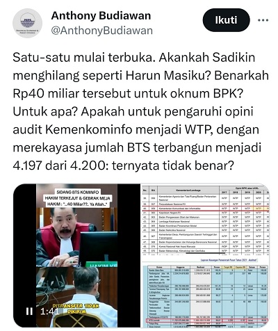 “Satu-satu mulai terbuka. Akankah Sadikin menghilang seperti Harun Masiku? Benarkah Rp40 miliar tersebut untuk oknum BPK? Untuk apa? Apakah untuk pengaruhi opini audit Kemenkominfo menjadi WTP, dengan merekayasa jumlah BTS terbangun menjadi 4.197 dari 4.200: ternyata tidak benar?,” kata Anthony Budiawan.